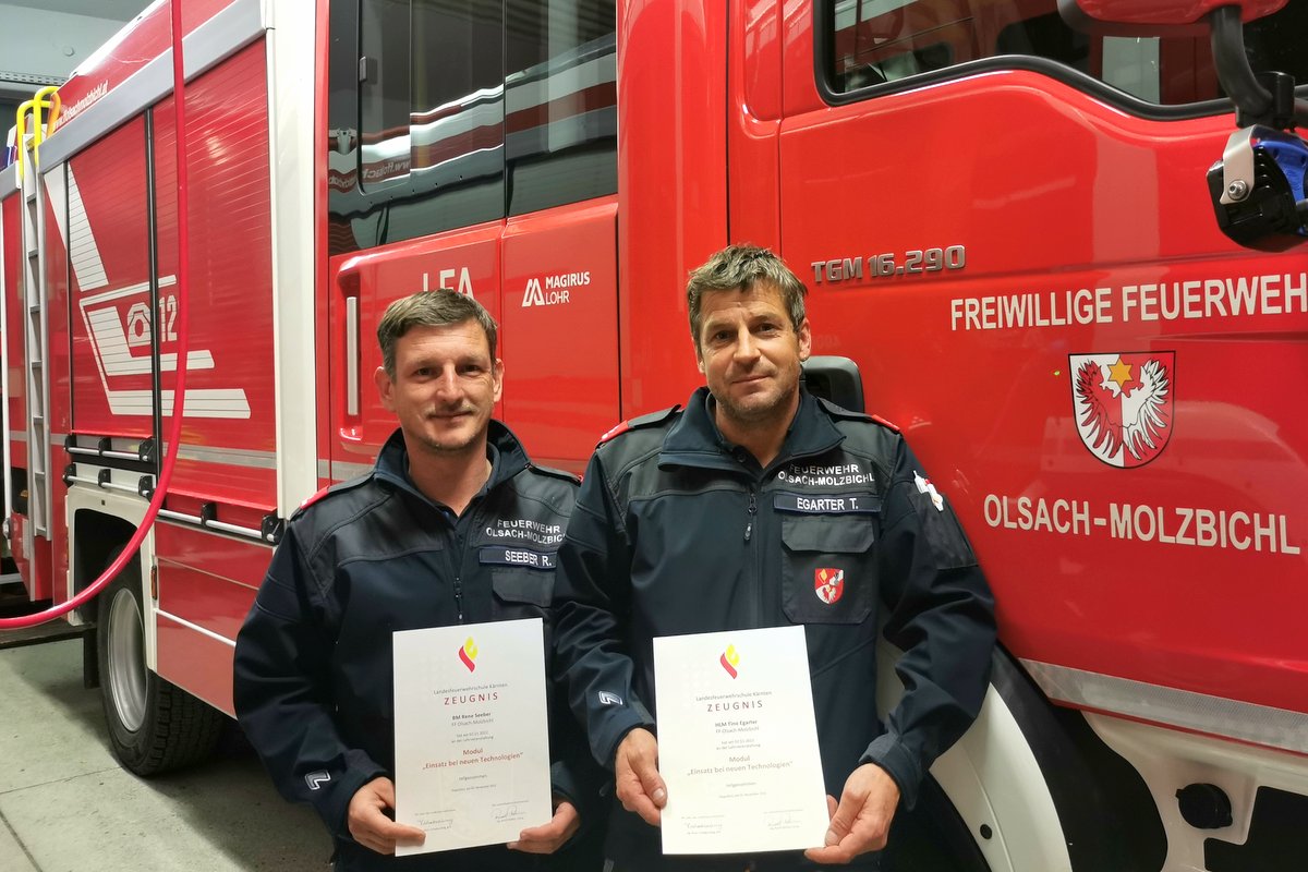 Die rasante Technologieentwicklung in den unterschiedlichsten Bereichen erfordert auch eine entsprechende Weiterentwicklung der Feuerwehr. Beispielsweise verlangen Einsätze mit Akku-Bränden, Fahrzeuge mit alternativen Antrieben, oder Photovoltaikanlagen das nötige Wissen, um zielführende Einsatzmaßnahmen einsetzten zu können. Auch der Sicherheitsfaktor und das Einschätzen von Gefahren spielen dabei eine wesentliche Rolle. Das an der Kärntner Landesfeuerschule angebotene Ausbildungsmodul „Einsatz mit neuen Technologien“, behandelt aktuelle Themenbereiche und bietet eine gute Möglichkeit am Puls der Zeit zu bleiben. Unsere beiden Gruppenkommandanten Tino Egarter und Rene Seeber haben kürzlich an dieser Weiterbildung teilgenommen und konnten viele interessante Erkenntnisse mitnehmen.