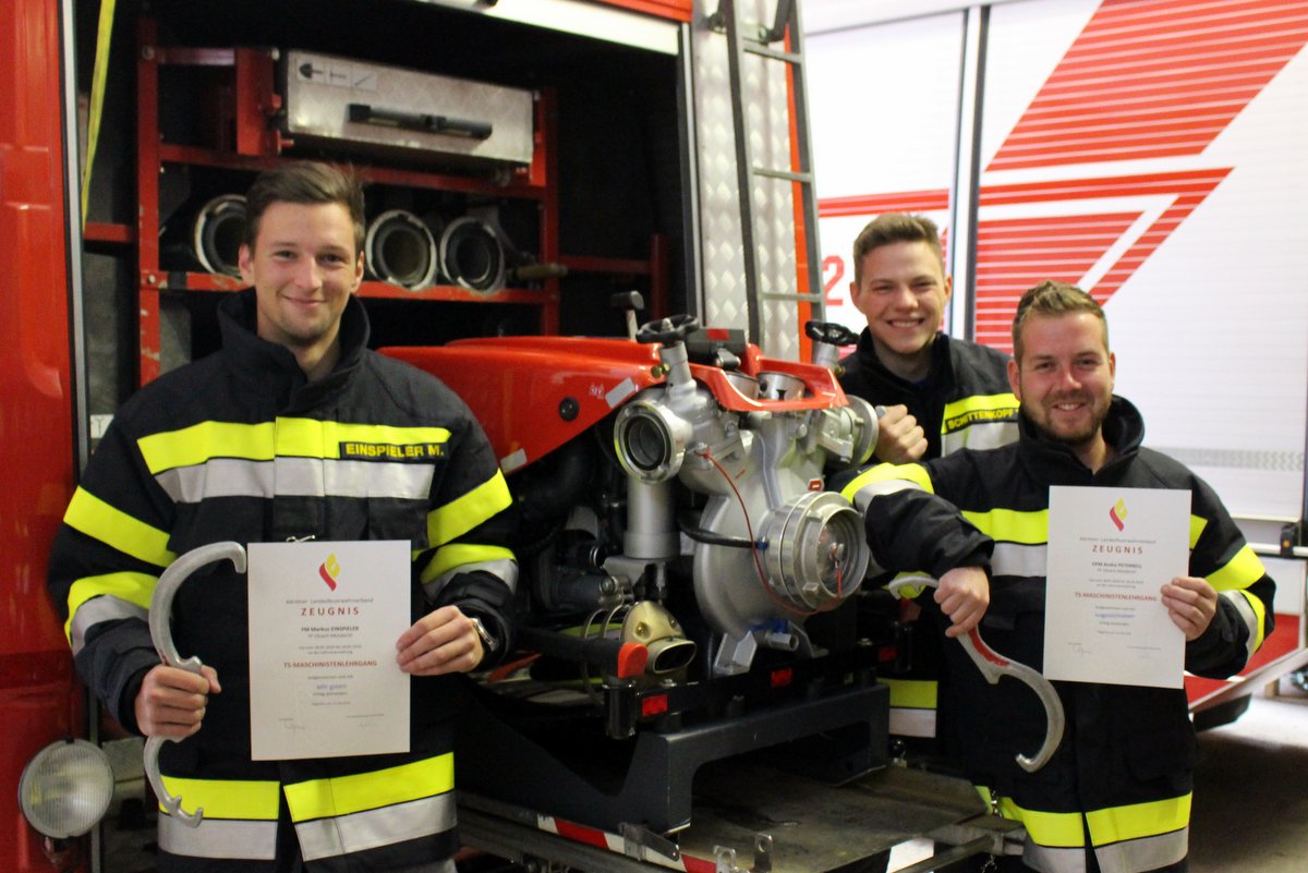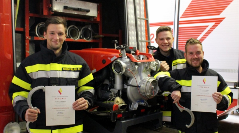 Unsere Kameraden Markus Einspieler, Andre´ Peternell und Tobias Schittenkopf absolvierten am vergangenen Wochenende die Ausbildung zum TS-Maschinisten. Grundlagen zur Maschinistentätigkeit, sowie vor allem das praktische Arbeiten mit der Tragkraftspritze (TS), den Schmutzwasser- und Tauchpumpen sowie auch den Notstromaggregaten sind der Schwerpunkt dieser zweitägigen Lehrveranstaltung, welche mit einer Prüfung abzuschließen war. Den Höhepunkt stellte eine Übung mit der Thematik „Löschwasserförderung über längere Wegstrecken“ dar. Wir gratulieren unseren Kameraden zur erfolgreich absolvierten Ausbildung!