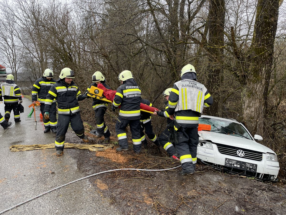 Den Abschluss des Tagesprogrammes bildete eine Gesamtübung. Nach dem Übungsbefehl – Nebengebäudebrand – rückten beide Fahrzeuge in Richtung Übungsort aus und trafen bereits vorbereitende Maßnahmen. Während der Anfahrt änderte sich die Situation jedoch abrupt. Es wurde ein Einsatzszenario über einen Verkehrsunfall eingespielt. Rasches Umdenken und gezieltes Handeln war erforderlich, um den Verkehrsunfall mit eingeklemmter Person auf einer Nebenstraße der B100 in Olsach zu bewältigen.