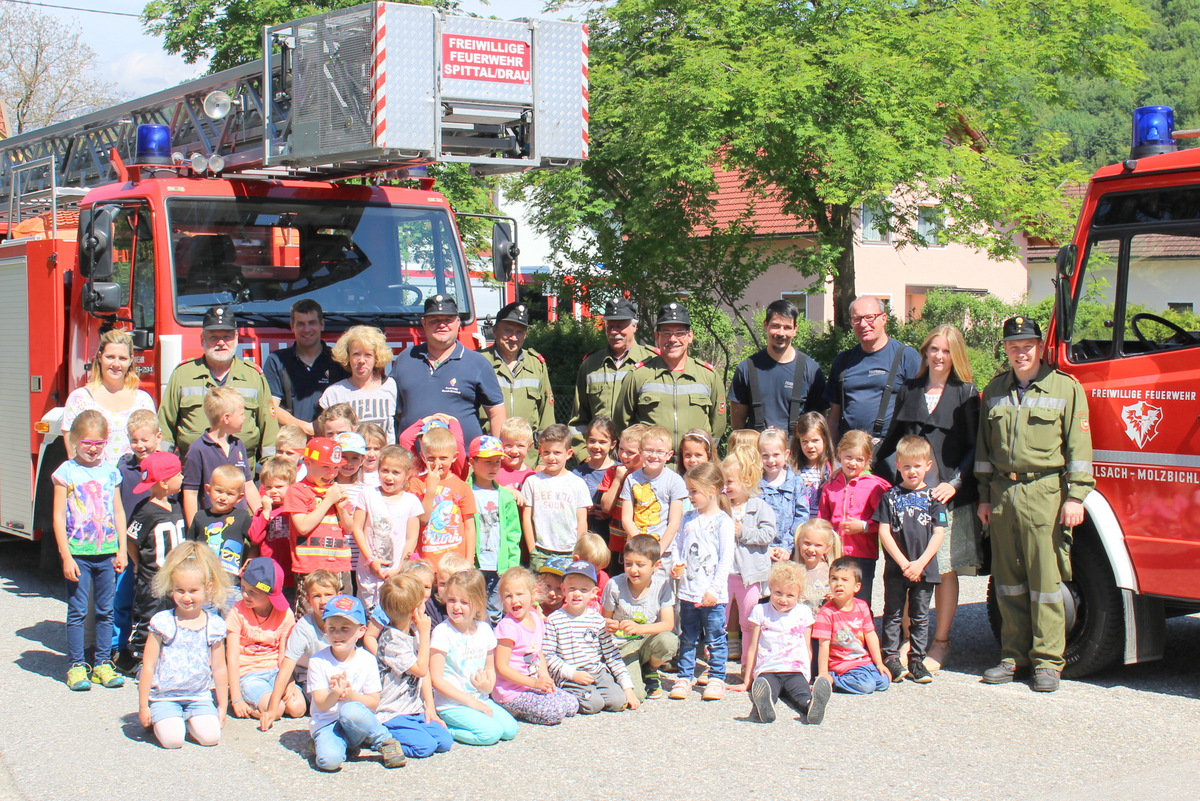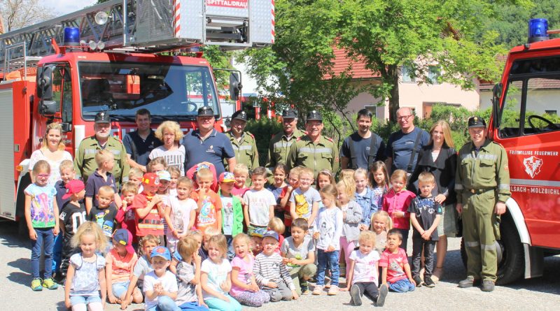 Auch in diesem Jahr besuchten die Kameraden der Feuerwehr Olsach-Molzbichl wieder die Kindergartenkinder im Rothenthurner Kindergarten. Über 40 Mädchen und Buben beschäftigten sich einen Vormittag lang mit dem Thema Feuerwehr. Bei vier Stationen gab es für die Kinder wieder zahlreiche Ausrüstungsgegenstände zu bestaunen und auszuprobieren. Wasserspritzen und Platz nehmen im Feuerwehrauto durfte dabei natürlich nicht fehlen. Wie und warum sich ein Feuerwehrmann in einen Atemschutzgeräteträger verwandelt, wurde ebenfalls vorgeführt. Das Highlight des Tages: Mit der Drehleiter der Feuerwehr Spittal/Drau wurden die Kinder aus dem ersten Stockwerk des Kindergartengebäudes „gerettet“. Zum Abschluss hatten wir noch eine kleine Überraschung parat und spendierten den Kindern ein Eis. Wir bedanken uns ganz herzlich für die Einladung und freuen uns auf ein Wiedersehen.