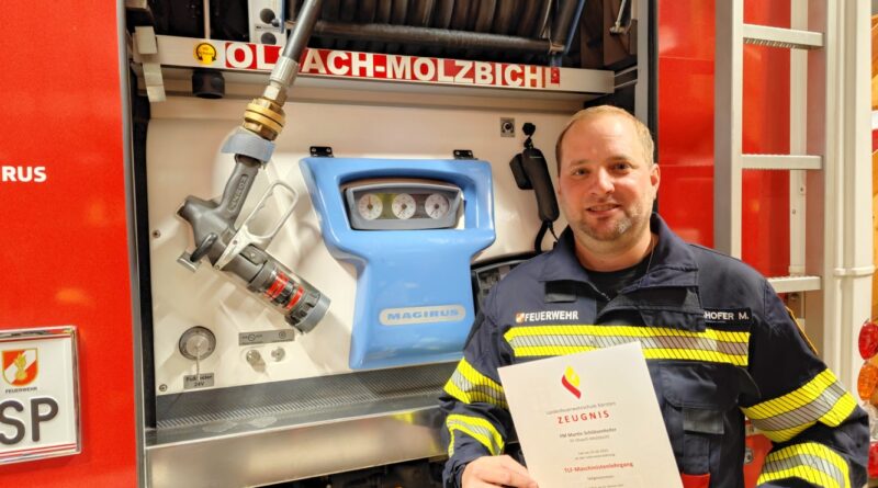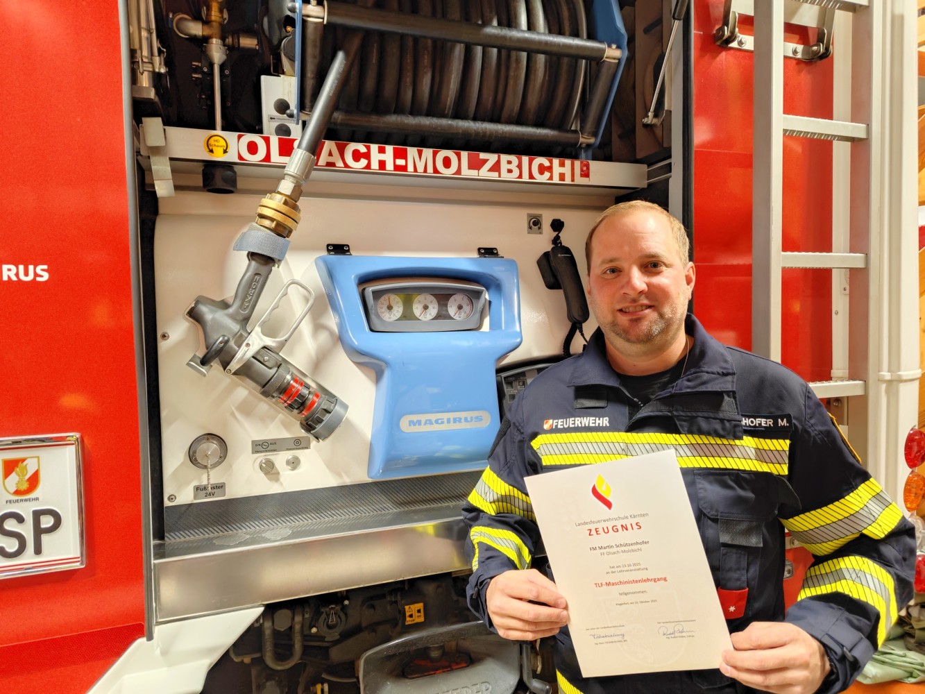 Am Donnerstag, den 23.10.2025 absolvierte unser Kamerad Martin Schützenhofer den TLF-Maschinistenlehrgang an der Landesfeuerwehrschule Kärnten. Mit den, bei dieser Ausbildung erlangten Fähigkeiten ist Martin nun in der Lage, die Einbaupumpe des TLFA-4000-200 im Übungs- und Einsatzdienst zu bedienen. Die Feuerwehr Olsach-Molzbichl gratuliert recht herzlich zur erfolgreich absolvierten Ausbildung!