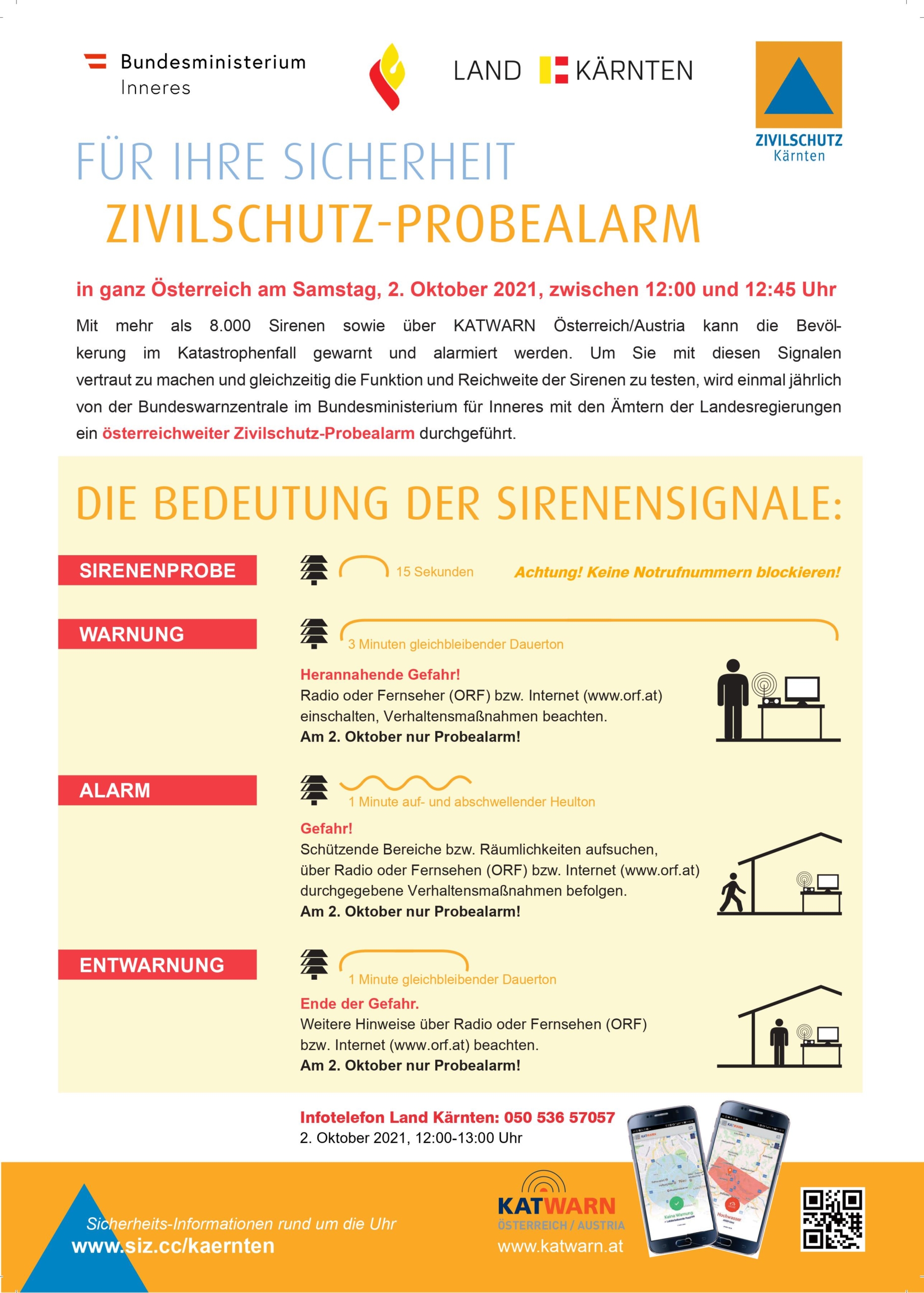 Am Samstag, den 2. Oktober 2021 erfolgt ab 12:00 Uhr die jährliche Zivilschutz-Sirenenprobe. Der Probealarm dient einerseits zur Überprüfung der technischen Warn- und Alarmeinrichtungen, andererseits sollen damit aber auch der Bevölkerung die Zivilschutzsignale in Erinnerung gebracht werden. Nutzen Sie daher die Gelegenheit, um sich mit den Sirenensignalen für den Katastrophenfall vertraut zu machen. Mit der App „KATWARN Österreich“erhält die Bevölkerung die Katastrophenwarnungen auch direkt aufs Smartphone.